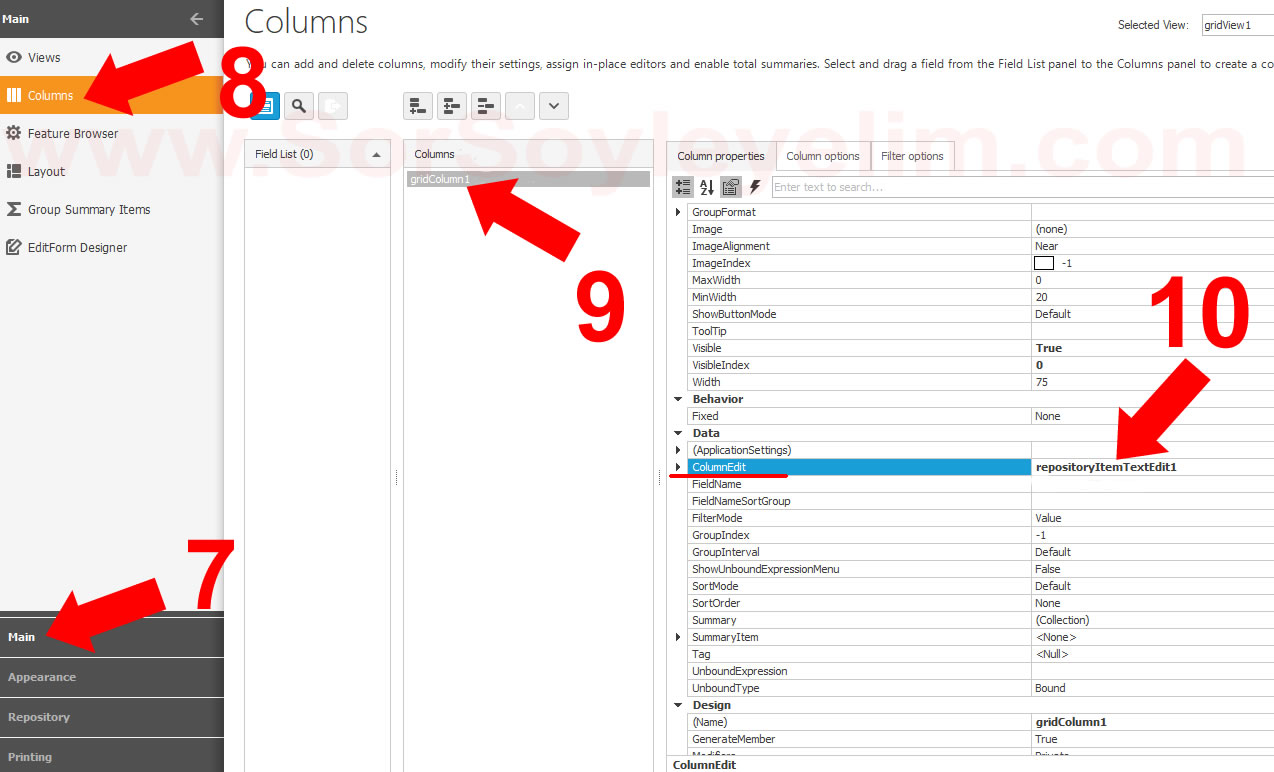 10. Seçtiğiniz kolonun property kısmından ColumnEdit'ine oluşturduğumuz repositoryItem'i ekleyelim.